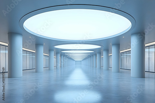 Modern hallway, glass walls, city view, ceiling lights, architecture