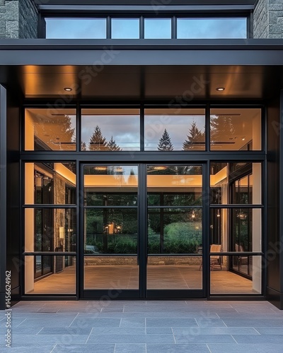 Modern home entrance with black framed glass doors reflecting garden view from patio level perspective