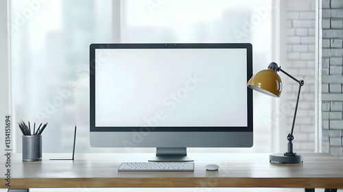 Modern Home Office Desk Setup With Blank Screen Computer Yellow Desk Lamp and City View in Bright Room