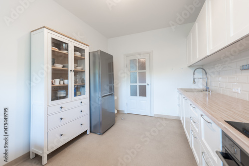Modern Home White Kitchen Interior Design With Wooden Countertop and Open Storage Cabinet