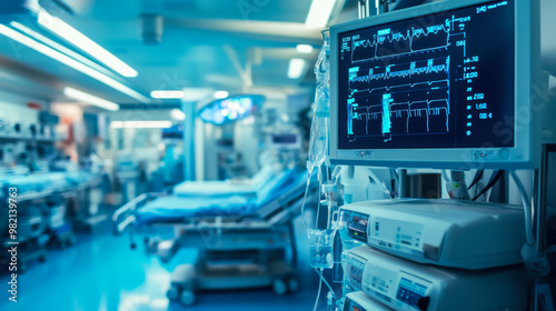 Modern hospital room with advanced monitoring equipment and empty patient bed in a busy medical facility during evening hours