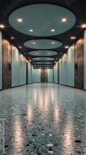 Modern Hotel Corridor Minimalist Interior Design Blue Walls Recessed Lighting