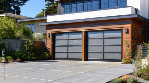 Modern house with stylish garage doors situated in a serene neighborhood surrounded by greenery under clear blue skies