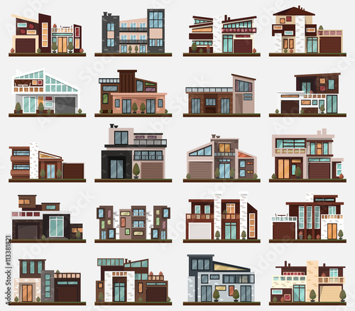 Modern houses or buildings with garage and bushes