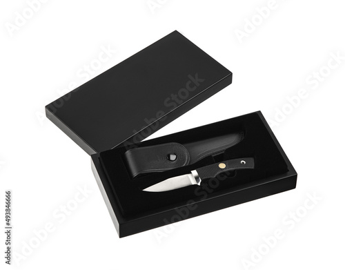 Modern hunting knife with silver blade and rubber handle. Steel arms. Isolate on a white back