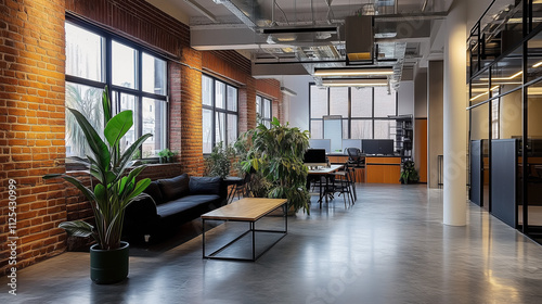 Modern Industrial Office Space Design | Contemporary Open Plan Workspace with Natural Elements | Professional Interior Design with Exposed Brick and Glass Partitions | Urban Loft Style Commercial Offi