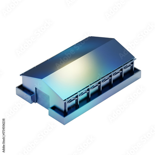 Modern industrial warehouse building with a metallic blue finish, isolated on transparent background