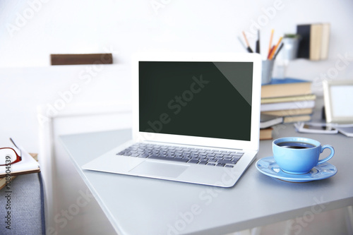 Modern interior. Comfortable workplace. Table with laptop and cup of coffee on it, close up