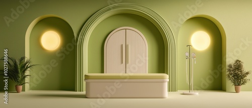Modern interior design featuring soft green walls, minimalistic furniture, and stylish plants for a calming ambiance.