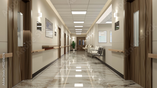 Modern interior of luxury clinic hallway, clean marble floor and wood finish in office or hospital, hall with beige brown design. Concept of business, building, company
