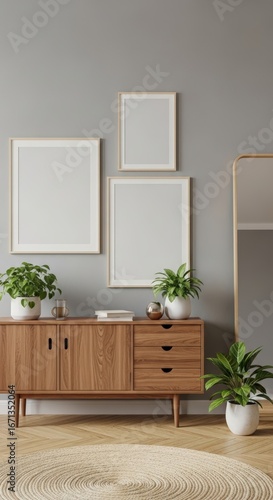 Modern Interior with Blank Frames and Plants featuring Interior, Modern, Home, Decor Design Living Room Furniture Wooden Plant Frame Blank