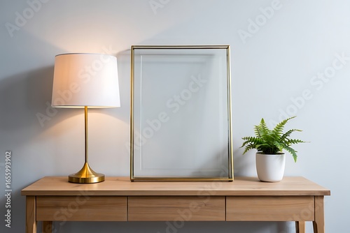 Modern interior with gold frame lamp and fern on wooden console table