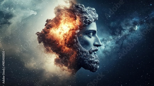 Modern interpretation of Brahma, cosmic energy radiating from his form, surrounded by galaxies, Hinduism and mythology