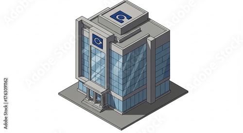 Modern Isometric Office Building with Glass Facade and Blue Accents.