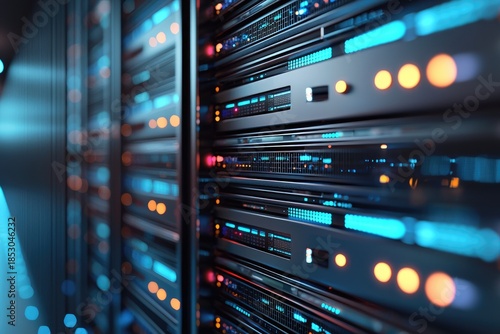 Modern IT data center server racks with illuminated status lights and high density computing hardware, perfect for enterprise infrastructure and digital technology