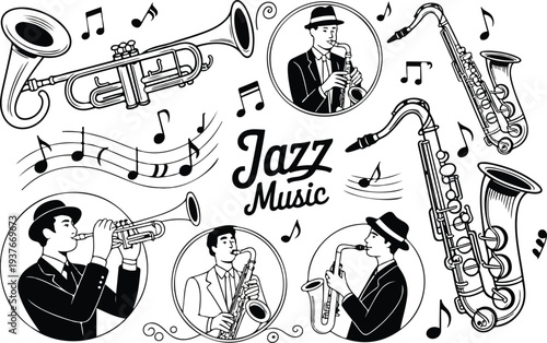 Modern Jazz Lettering Design with Microphone and Musician Silhouette in Clean Outline Vector Style