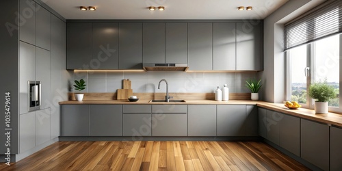 Modern kitchen design featuring sleek gray cabinets, wooden countertops, a stainless steel sink, and a large window with natural light.