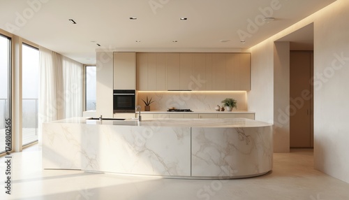 Modern kitchen interior boasts spacious, curved marble island with integrated sink. Sleek light beige cabinetry includes wall oven, gas stove. Large windows offer bright balcony view. Warm natural