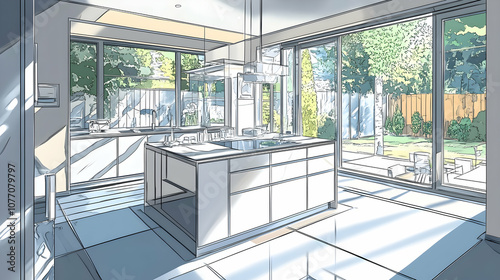 Modern kitchen interior design with large windows and a view of a green backyard.