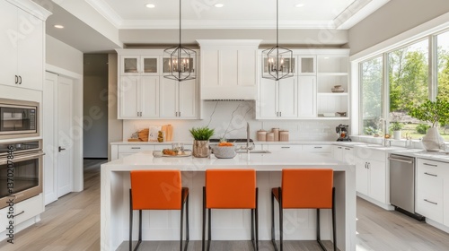 Modern Kitchen Island, White Cabinets, Orange Stools