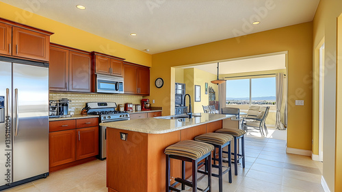 Modern kitchen island with ocean view, bright yellow walls, breakfast bar, and patio access. Ideal for real estate listings