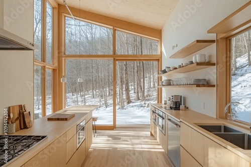 Modern kitchen with large windows overlooking a snowy forest landscape.