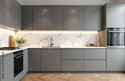 Modern kitchen with matte grey cabinets and quartz counters. Marble backsplash adds elegance. Integrated oven and sleek design create a clean, organized space. Herringbone floor completes the look.