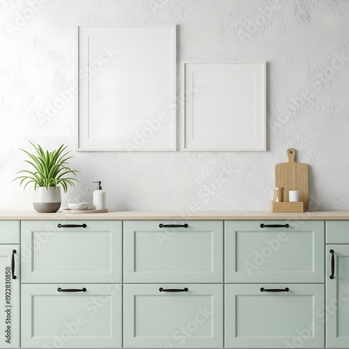 Modern kitchen with minimalist decor and light green cabinetry illustration
