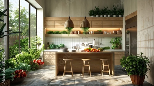Modern Kitchen with Wooden Accents and Green Plants.