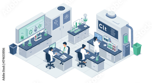 Modern laboratory scene with scientists working in isometric design