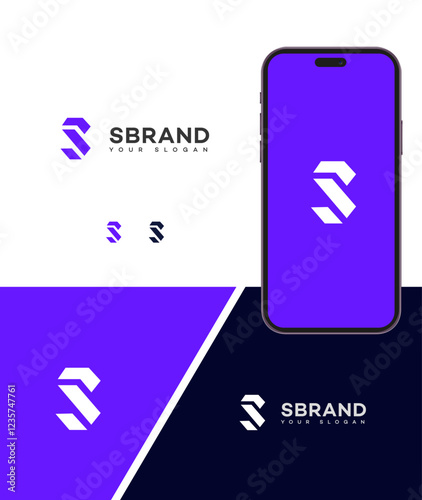 Modern letter S logo design concept. Includes brand identity presentation with a smartphone app mockup. Ideal for technology or corporate businesses.