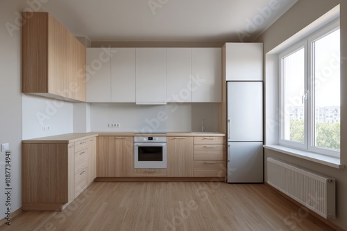 Modern light wood and white kitchen features built-in appliances and a large window.