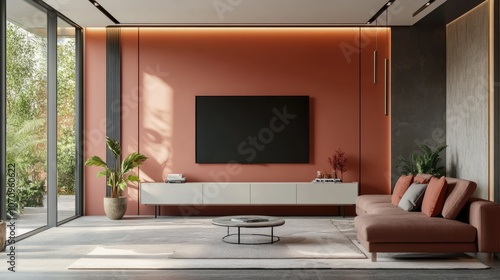 Modern Living Room Decor with TV Cabinet on Beige Wall Background