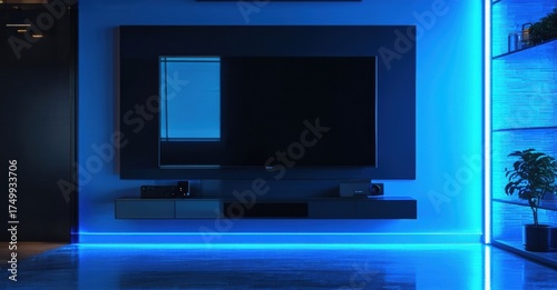Modern living room features wallmounted television, sleek furniture, vibrant blue ambient lighting. Minimalist design creates dramatic effect.