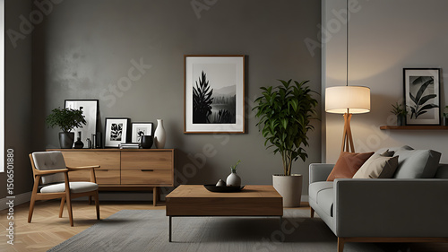 Modern living room featuring a gray wall, wooden furniture