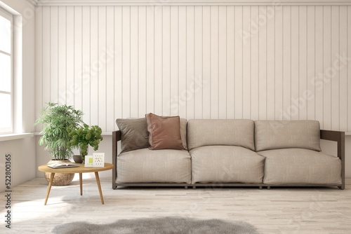 Modern living room in white color with sofa. Scandinavian interior design. 3D illustration