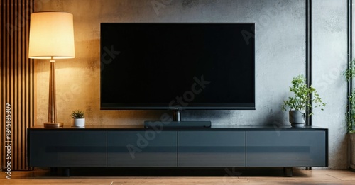 Modern living room interior. Dark console supports large television. Lamp provides warm light, plants add life. Minimalist design.