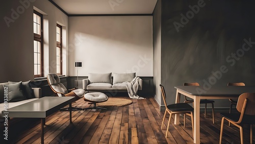 Modern living room interior with blank wall, sofa, lounge chair, table, wooden wall and floor.