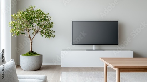 Modern living room interior with flat-screen TV, potted plant, and minimalist furniture.