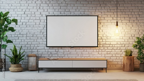 Modern Living Room Interior with White Brick Wall, TV and Plants