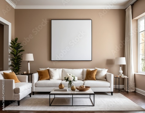 Modern Living Room Interior with White Sofa and Large Blank Canvas