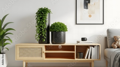 Modern living room interior with wooden console and green plants