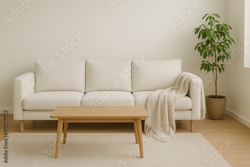 Modern living room with a light sofa and wooden coffee table in a minimalistic setting