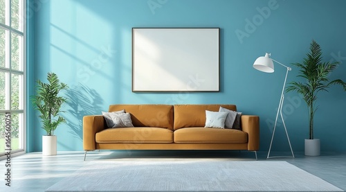 Modern living room with blue walls featuring a brown sofa and stylish decor