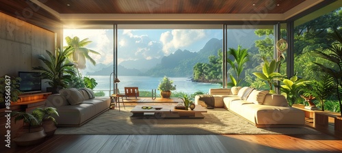 Modern Living Room with Large Windows and Lush Garden View