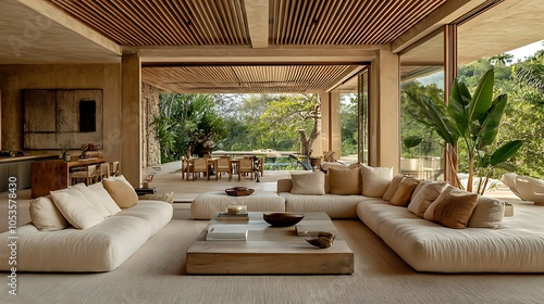 Modern living room with open design and natural elements.