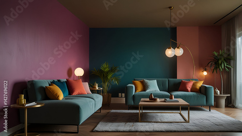 Modern living room with vibrant geometric wall teal sectional sofa colorful throw pillows round wooden coffee table and natural lighting from a large window