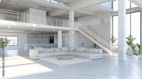 Modern Loft Interior Design with White Sofa Concrete Walls and Large Windows