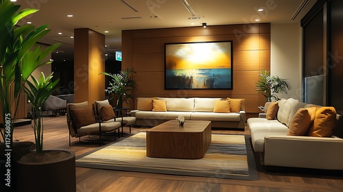 Modern lounge area featuring cozy seating and art display indoor