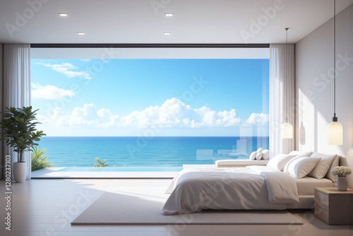 modern luxurious bedroom with ocean view bed nightstand lights